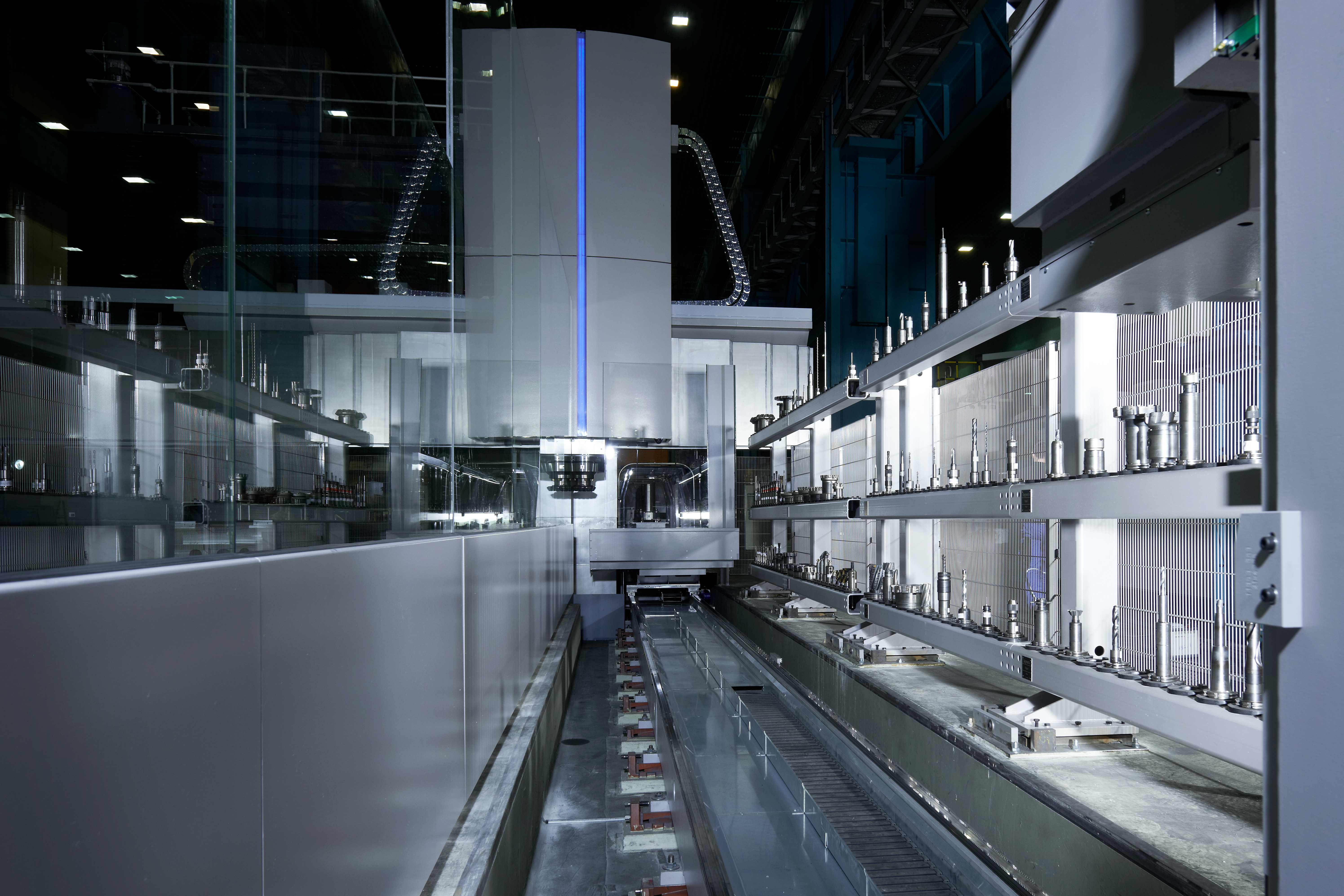 Unsere ProfiMill-Portalfräsmaschine in Gantry-Ausführung mit einem Palettenwechselsystem und zusätzlichem Plattenfeld im zweiten Arbeitsbereich, wird als Teil der vollautomatisierten Produktion in das kundenseitige Flexible Fertigungssystem (FMS) eingebunden. Über schienen- und fahrerlose Transportfahrzeuge (AGV) und insgesamt 10 Palettenrüst- und Speicherplätzen wird die ProfiMill mit den 3.000 x 8.000 mm großen Paletten versorgt, auf denen sich bis zu 60 t schwere Werkstücke befinden. Die ProfiMill ist mit automatischer Serviereinrichtung für die insgesamt 12 Fräsköpfe sowie einem automatischen Werkzeugwechselsystem in Regalausführung mit 300 Werkzeugplätzen inkl. Bedienroboter und angeschlossener Werkzeugkegelreinigung ausgestattet.